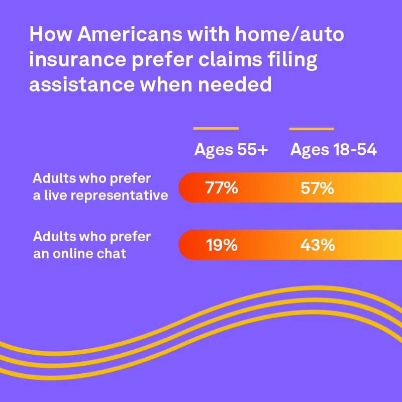 Our survey also provided insights, shown below, into preferred methods of communication. We learned that Americans 55+ prefer to speak with a live representative when in need of assistance while younger insurers prefer an online experience.