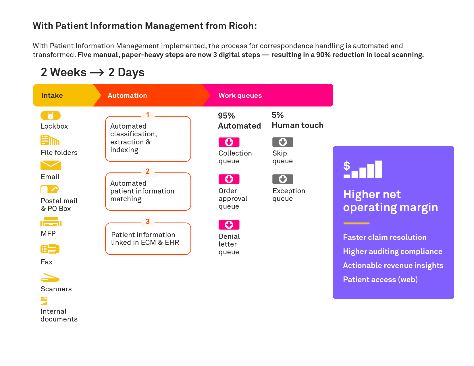 The way you work has changed. Manual processes, paper-based data, and multiple data siloes put immense pressure on profitability and data security for healthcare organizations. Patient Information Management eliminates paper workflows and faxing in a secured and automated way to speed claims processing, protect your bottom-line, and improve the overall patient experience.