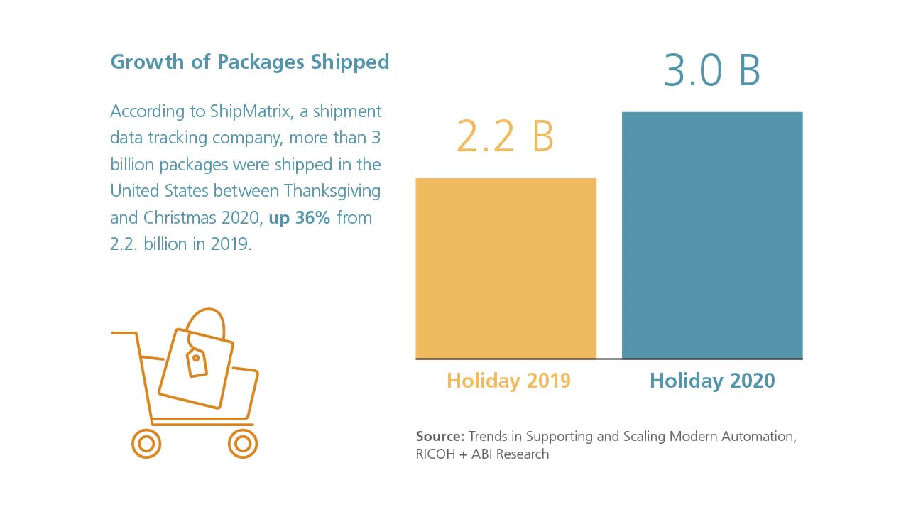 According to ShipMatrix, a shipment data tracking company, more than 3 billion packages were shipped in the United States between Thanksgiving and Christmas 2020, up 36% from 2.2. billion in 2019.