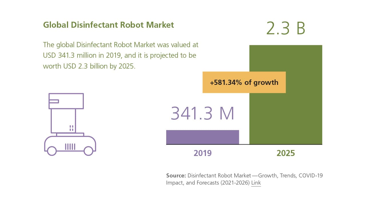 Lockdowns and concerns for public safety restricted the availability of workforces and pushed many industries to adopt automation to ensure business continuity. For high-traffic public spaces like airports and healthcare facilities, the need for improved cleaning solutions led to widespread rollouts of autonomous disinfection solutions.