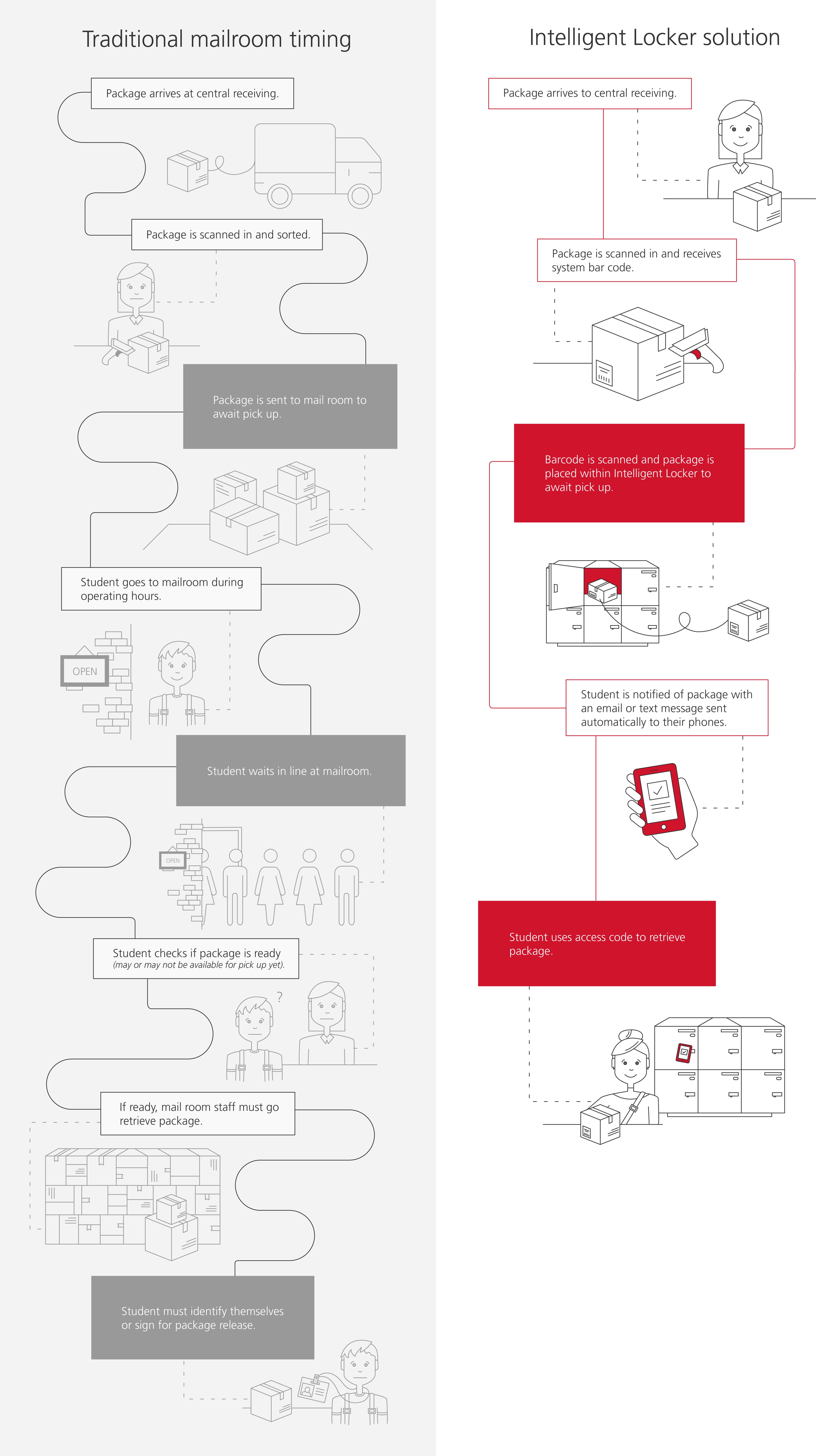 To help avoid the masses of students clamoring to get their packages at the same time, institutions are turning to Intelligent Locker solutions for their instant notifications and streamlined automation, allowing students to bypass the busy mailroom altogether.