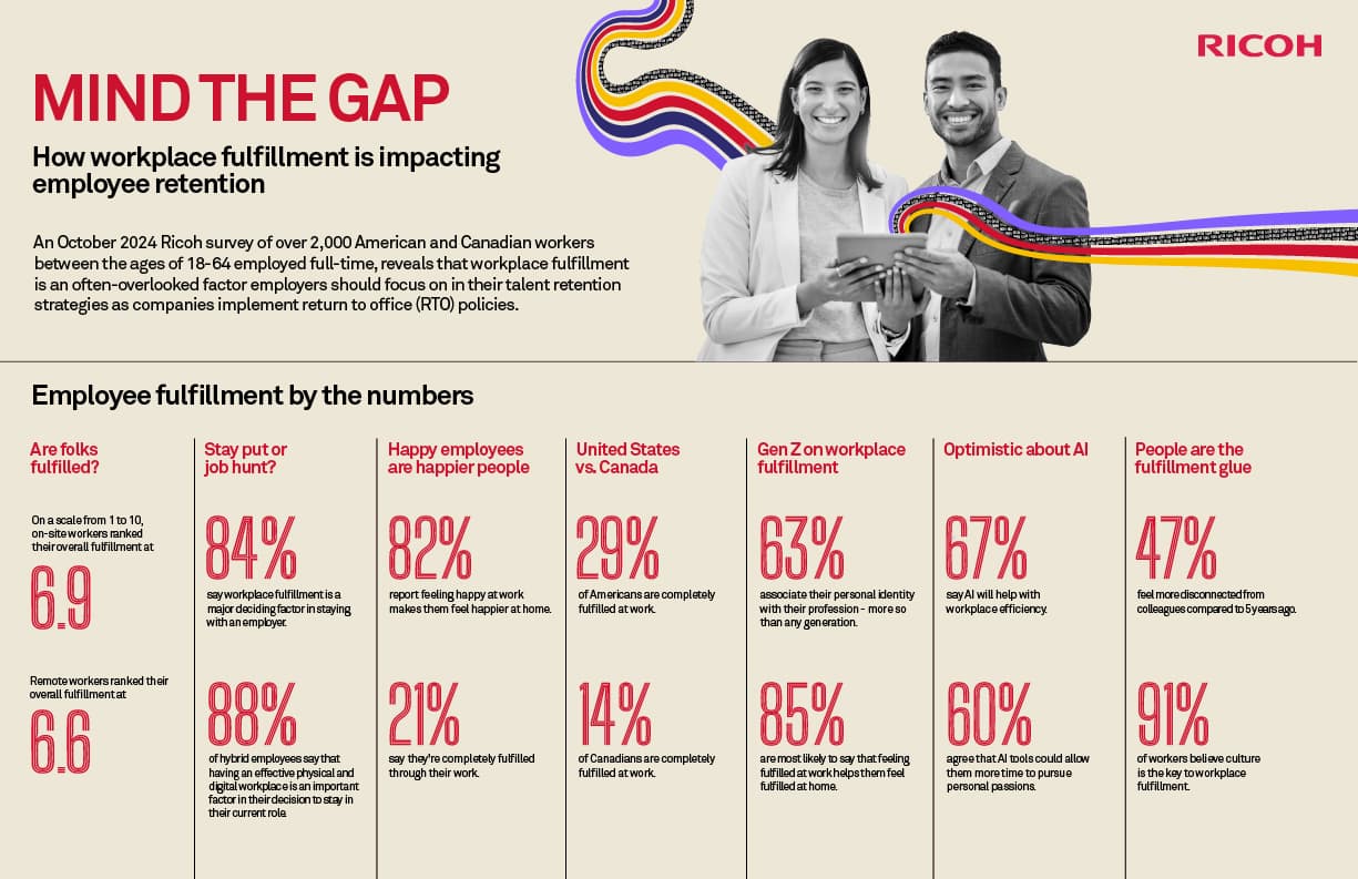 EXTON, PA, January 13, 2025 – The 2024 North American Workplace Fulfillment Gap Index released today by Ricoh USA, Inc., a leading provider of integrated digital workplace solutions and services, found that fulfillment is an often-overlooked factor employers should focus on in their talent retention strategies as companies implement return to office (RTO) policies.