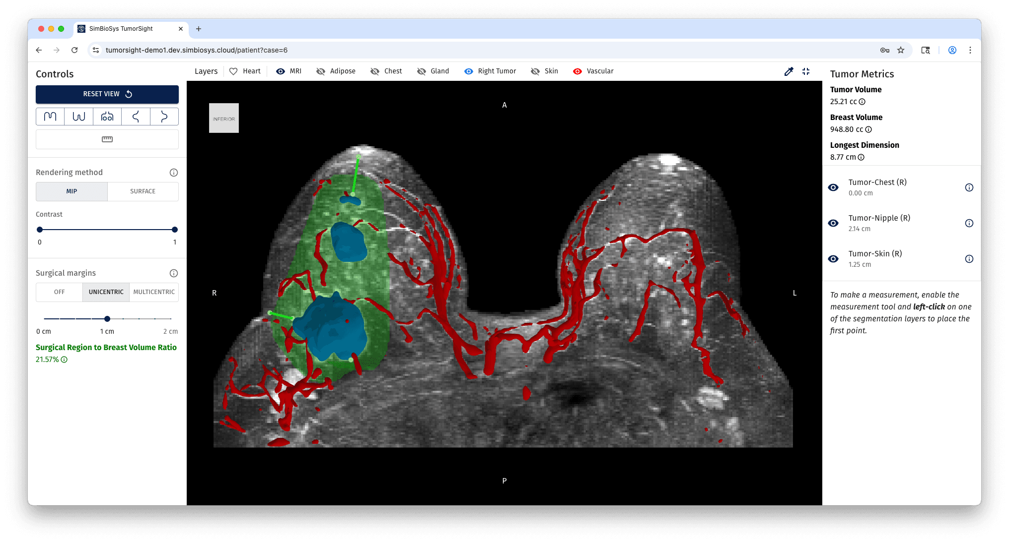 TumorSight™ Viz converts standard breast MRI into intuitive, 3D visualizations that reveal tumor size, location, and spatial orientation relative to surrounding anatomy—supporting more informed and individualized surgical decision-making. TumorSight Viz 1.3 offers industry-leading segmentation accuracy, delivers case results in minutes, and integrates with hospital PACS to streamline planning and coordination.1