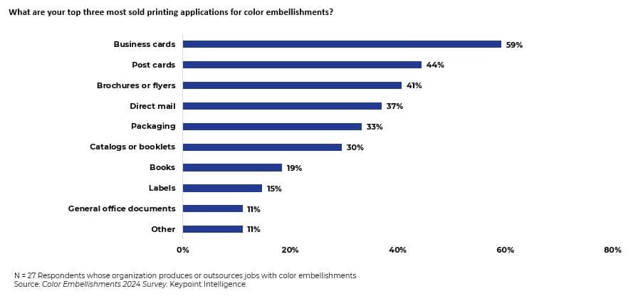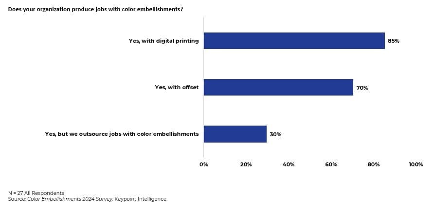 Whether it is metallic foils, neon colors, or textured finishes, embellishments are seen as key differentiators in a crowded marketplace. Keypoint Intelligence’s 2024 Color Embellishments survey highlights that PSPs and print buyers increasingly recognize the value of color embellishments. Most PSP respondents noted that they produce jobs with color embellishments fully in-house with digital and/or offset technology, thereby retaining control over the whole production process. In fact, this is one of the leading drivers for why PSPs invest in color embellishments in the first place.