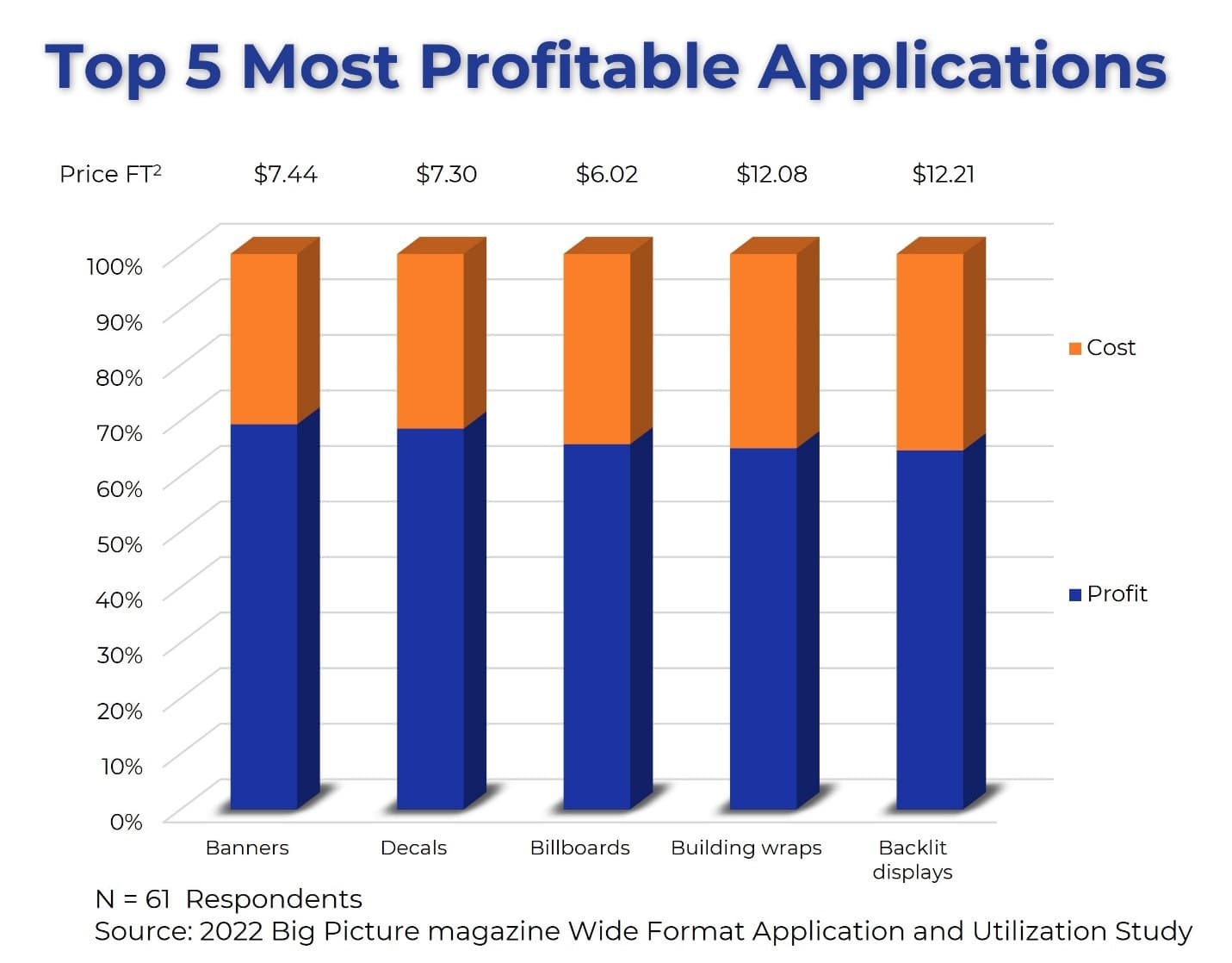 Profit margins across the top applications are notably strong, with banners, decals, billboards, building wraps, and backlit displays all achieving GPMs exceeding 56%. Banners and decals stand out as leaders in profitability, boasting margins of 69%, making them a reliable and high-performing choice for PSPs. Meanwhile, high-end applications like building wraps and backlit displays not only offer substantial margins but also command premium pricing, reflecting their added value and visual impact. These premium products present excellent opportunities for PSPs looking to differentiate their offerings, tap into higher-value markets, and maximize their overall returns.