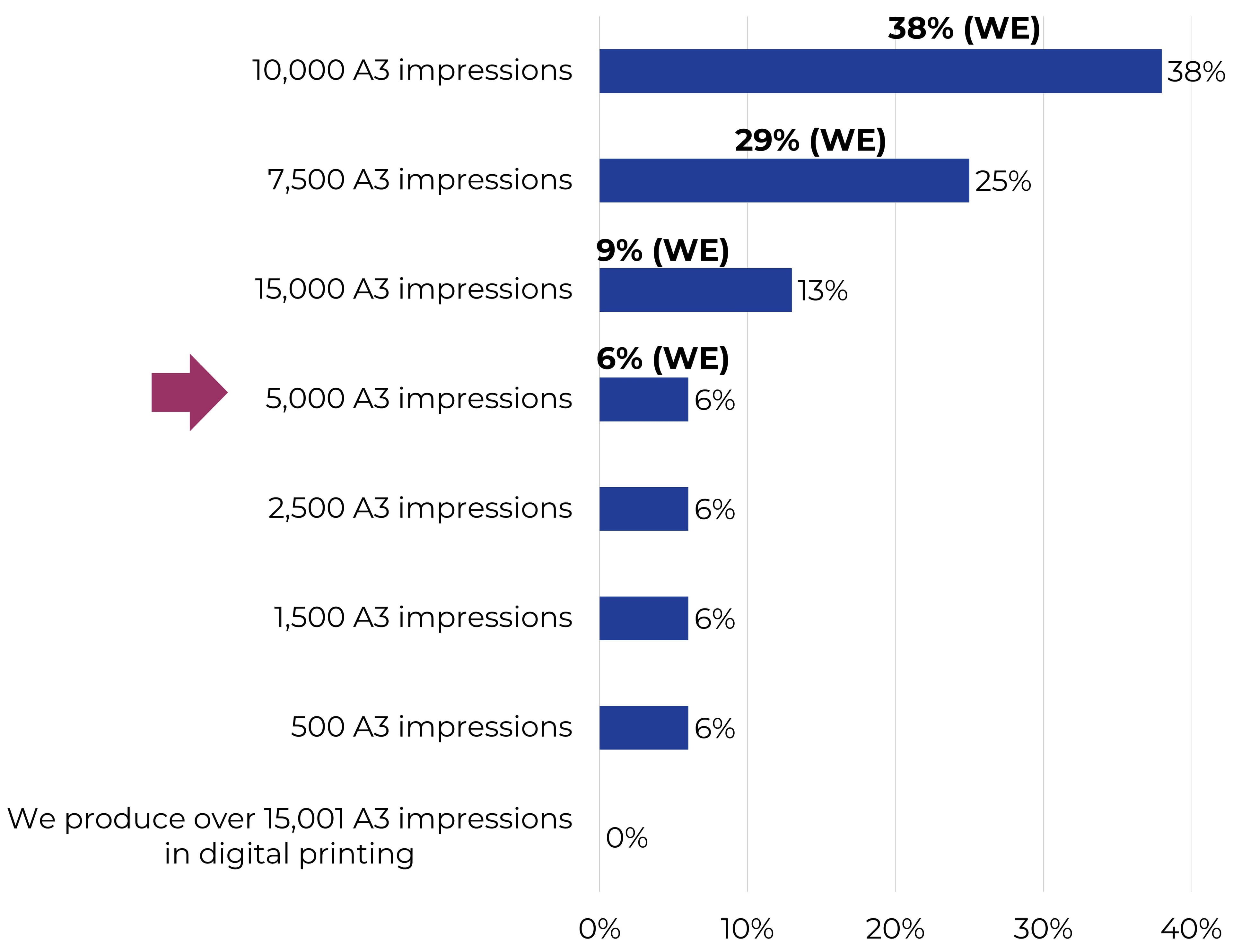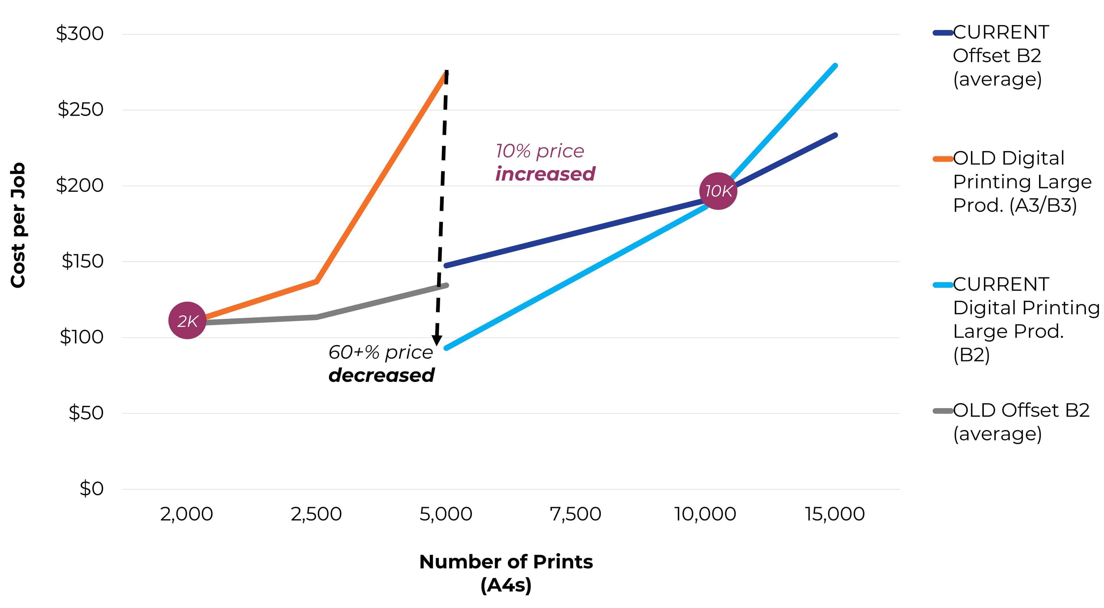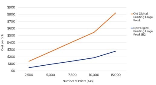 Different applications (direct mail campaigns, brochures, and promotional materials) often see varying crossover points depending on the complexity and volume of the job. Our survey research identified the most common crossover point for PSPs running jobs without variable data is at 10K A3 impressions (20K A4s). This highlights that when PSPs have robust large production digital printers and old low operation offset presses, digital printing starts to become more cost-effective.