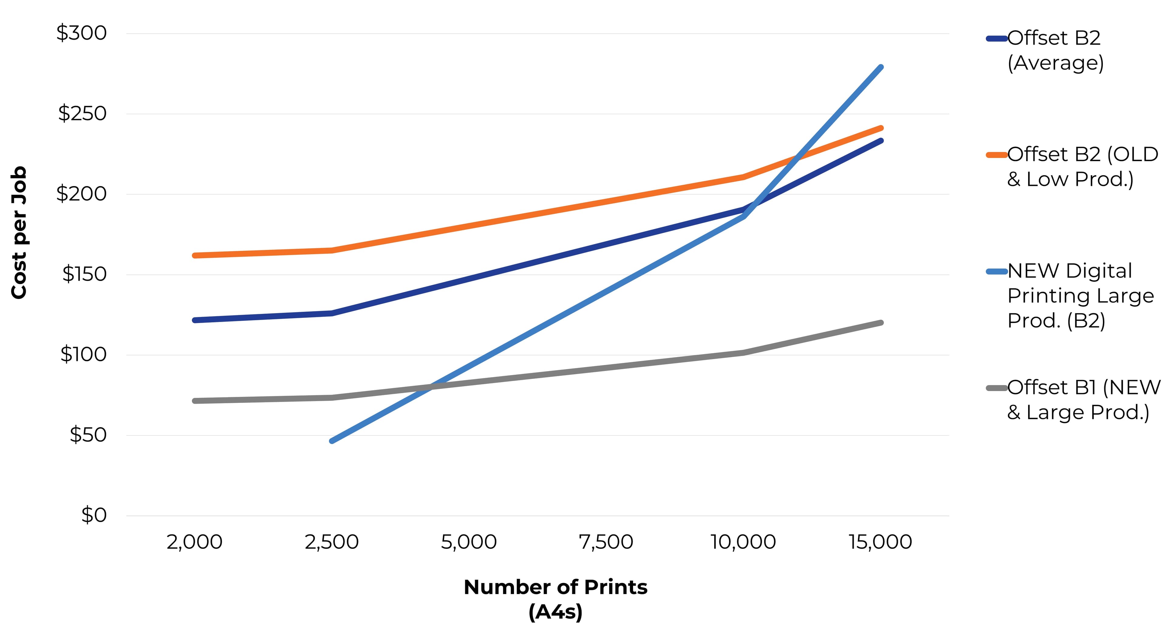 New, highly productive offset presses with low make-ready times can bring the crossover point down to around 4,000 A4 prints. In contrast, older, less efficient offset presses may push the crossover point up to 12,000 A4 prints or more.